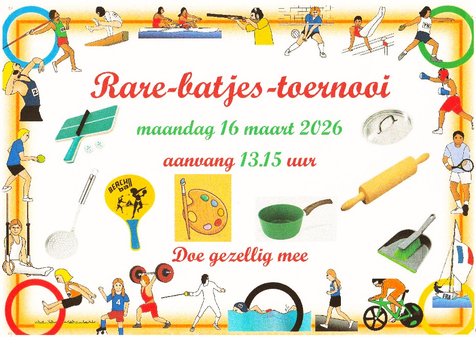 De oproep voor deelname aan het rare batjes toernooi lokte 20 enthousiaste spelers naar de Elanzaal om de uitdaging van het spelen met onorthodoxe ‘batjes’ aan te gaan. Van schuimspaan tot kaasplankje, van pannendeksel tot rasp, de handicaps lagen voor het oprapen: Veel onverwachte effecten, veel wisselingen in slagkracht en dosering bezorgden de spelers de nodige hoofdbrekens.